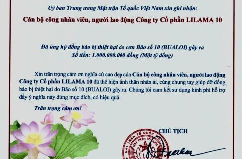 Sáng ngày 10 tháng 10 năm 2025, tại Văn phòng Ủy ban Trung ương Mặt trận Tổ quốc Việt NamCông ty Cổ phần Lilama 10 đã trao tặng số tiền 1.000.000.000 đồng (một tỷ đồng) nhằm hỗ trợ đồng bào các địa phương chịu thiệt hại nặng nề do cơn bão số 10 (Bualoi) và cơn bão số 11 (Matmo) vừa qua gây ra.